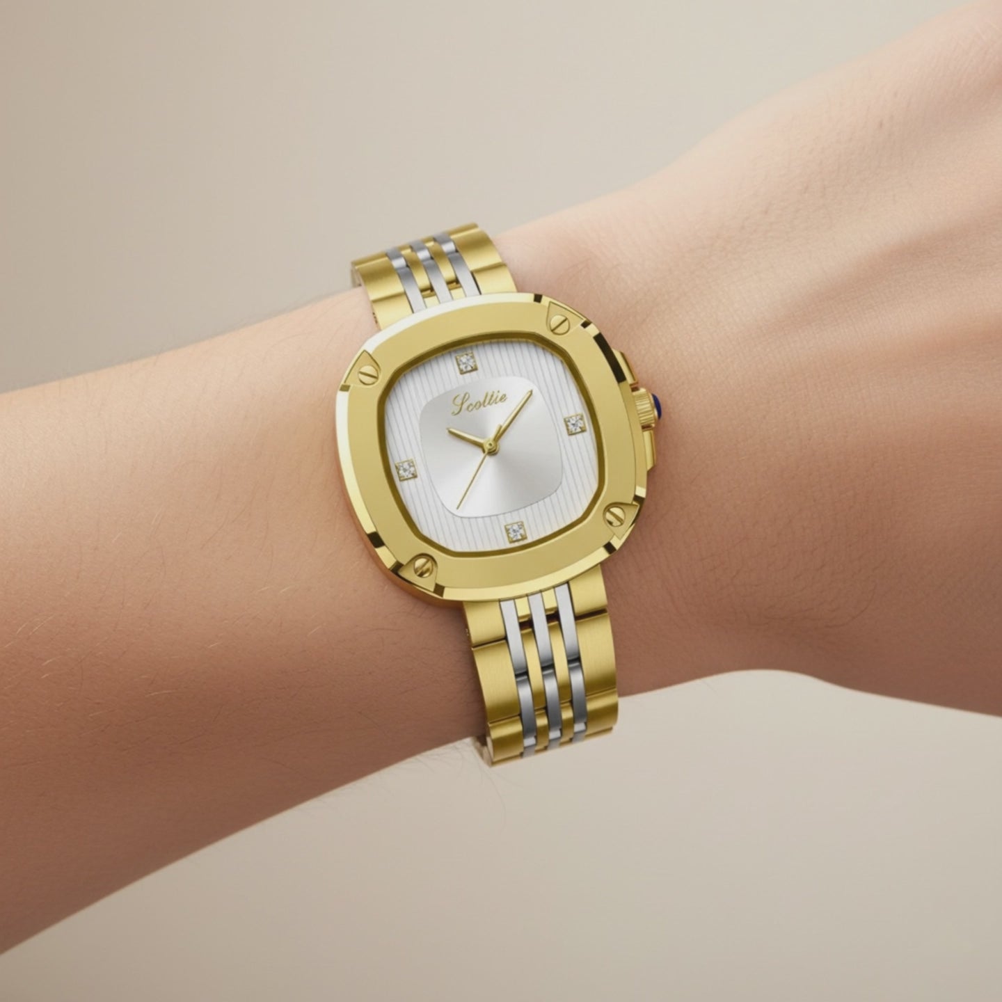 Rounded square case with a striped white dial and two-tone link bracelet. A bold yet versatile vintage design built for everyday wear.
