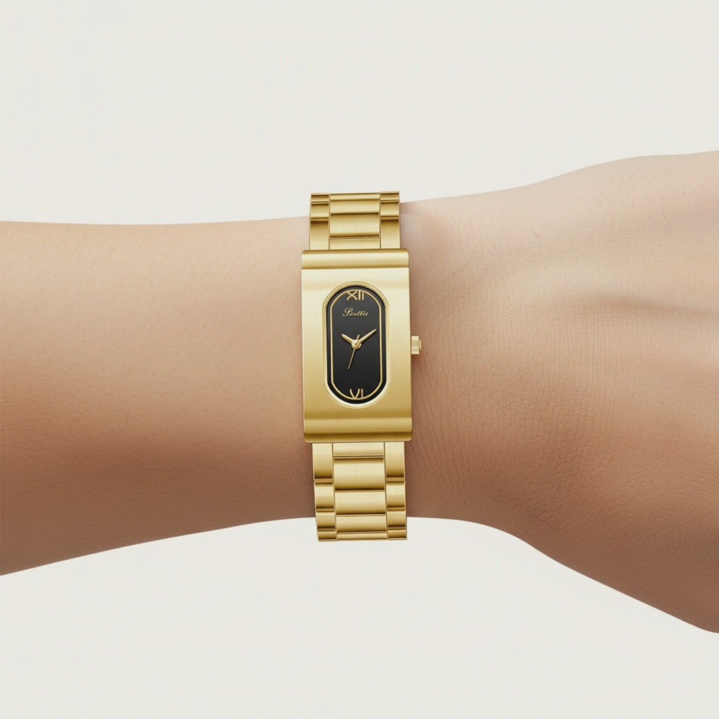 Rectangular case with a black Roman dial and solid link bracelet. A sleek vintage design with a bold contrast finish.