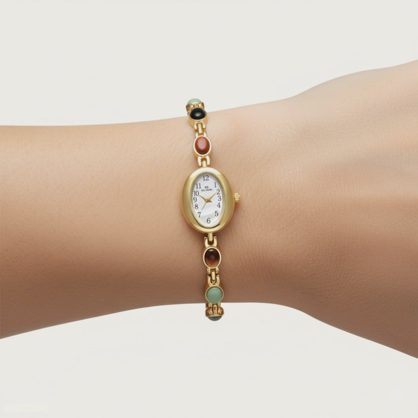 Oval case with a white dial, paired with a bracelet of multicolor stone links. A playful vintage design with a unique edge.