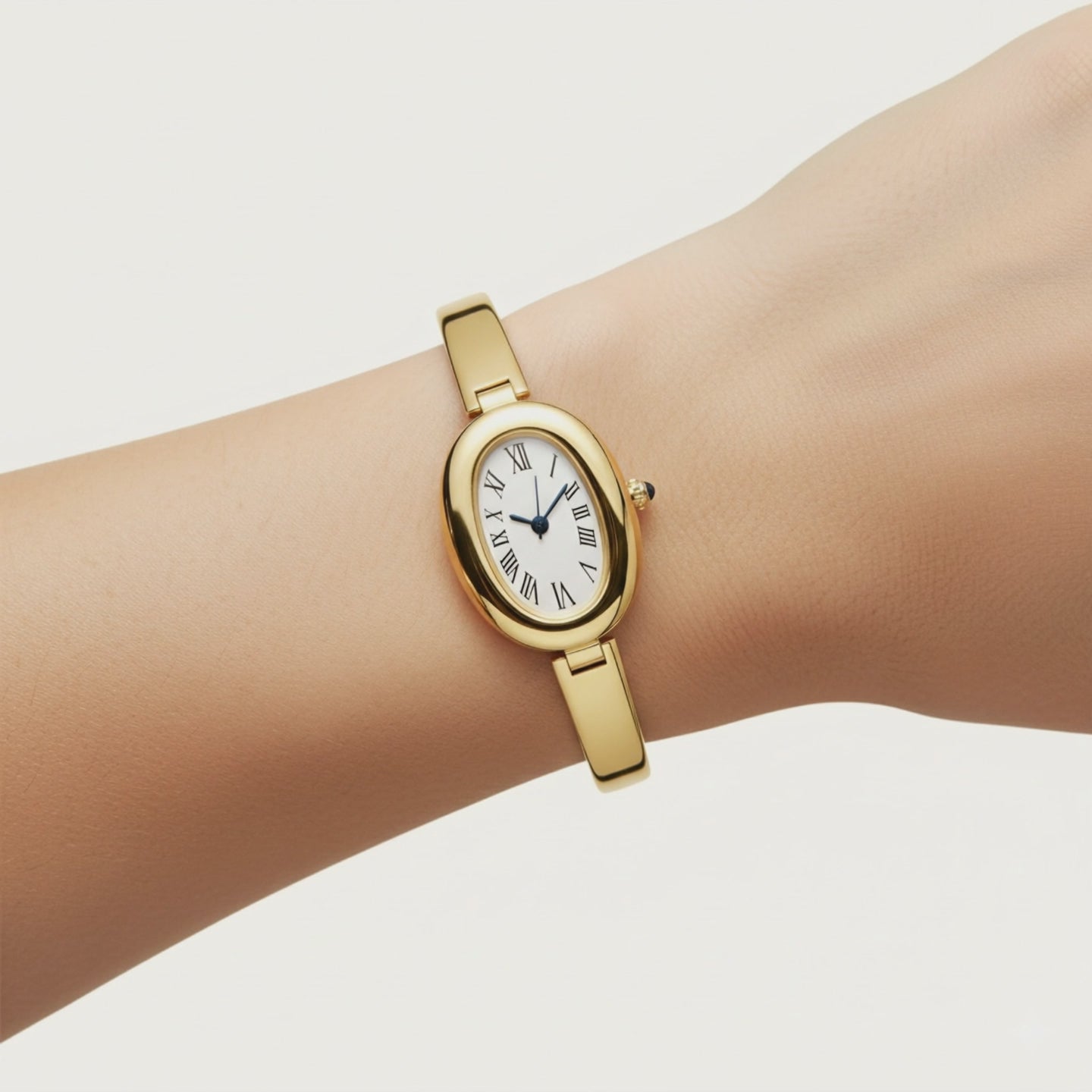 Slim oval case with a white Roman dial and polished bangle-style bracelet. A minimalist vintage design with timeless appeal.