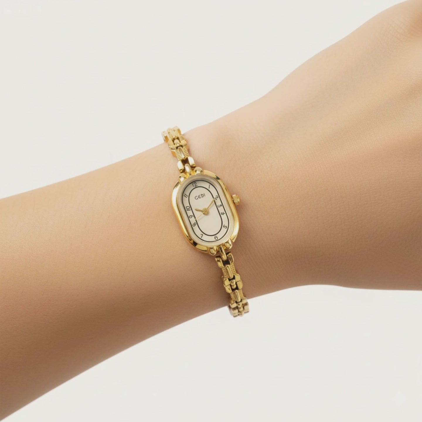 Clean white oval dial with a slim linked bracelet for a minimal, vintage touch. Lightweight and versatile, available in gold or silver.