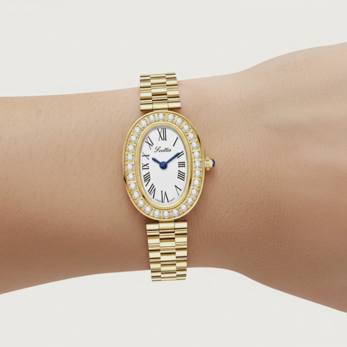 Oval case with a white Roman dial and a crystal-set bezel, finished with a slim link bracelet. A vintage style that’s sharp, elegant, and timeless.